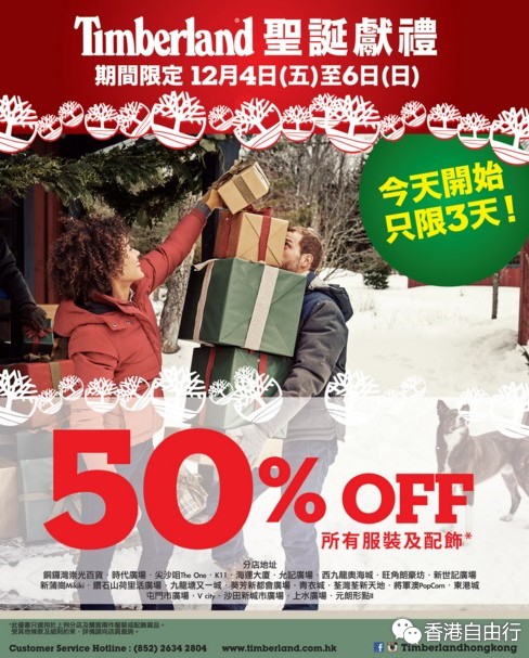 香港打折:Timberland圣诞献礼所有服装及配饰半价优惠(至15年12月6日)