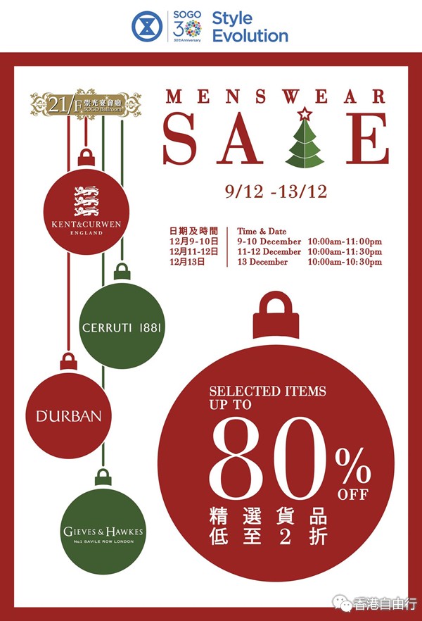 香港打折:sogo崇光百货铜锣湾店21/F精选货品低至2折购物优惠(15年12月9日至12月13日)