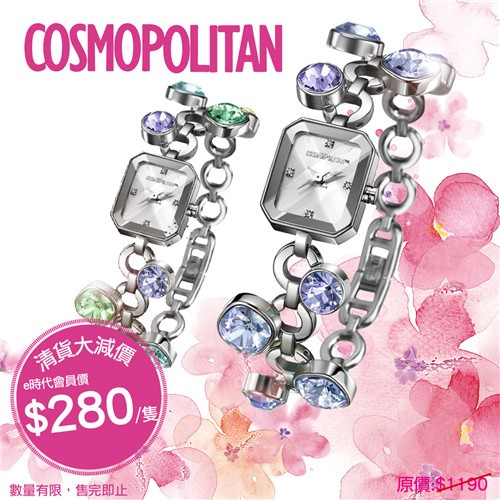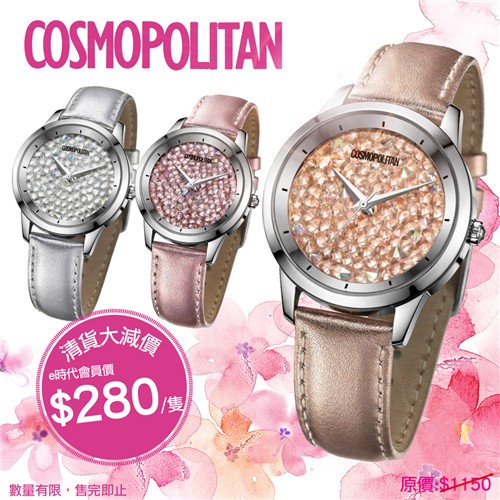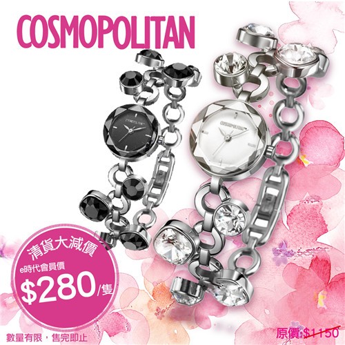 COSMO手表是由美国COSMOPOLITAN时尚杂志授权的时尚手表品牌,其设计时尚,个性鲜明,绝对是潮流的代表。手表用料名贵,日本原装进口石英机芯,表身採用不銹钢材质,镶嵌SWAROVSKI水晶,效果更为闪烁,而且还具有30米的生活防水性能。