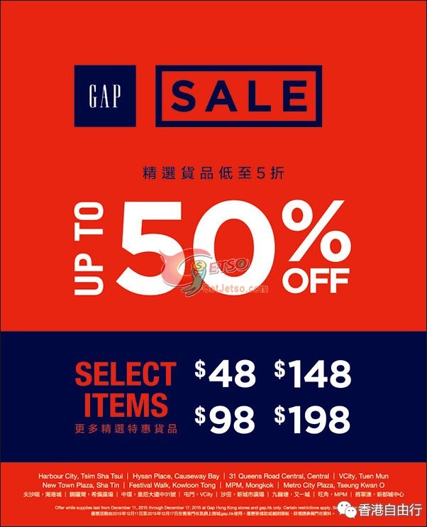 香港打折:GAP精选货品低至半价优惠(至15年12月17日);