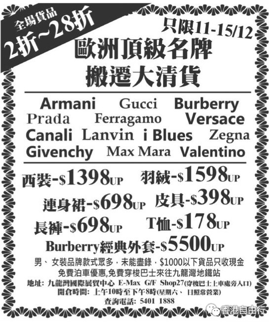 香港打折:欧洲顶级名牌低至2折开仓优惠(至15年12月15日)