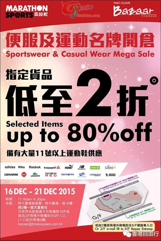 香港打折:时代广场Bazaar马拉松便服及运动名牌开仓低至2折优惠(至15年12月21日)