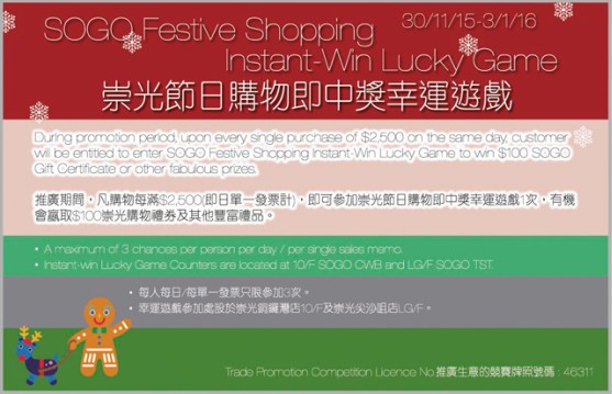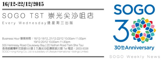 香港打折:sogo崇光百货尖沙咀店本周最新购物优惠(15年12月16日至12月22日)