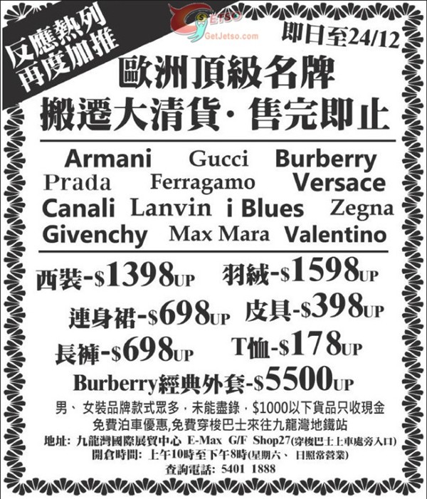 香港打折:欧洲顶级名牌再度加推开仓优惠(至15年12月24日)