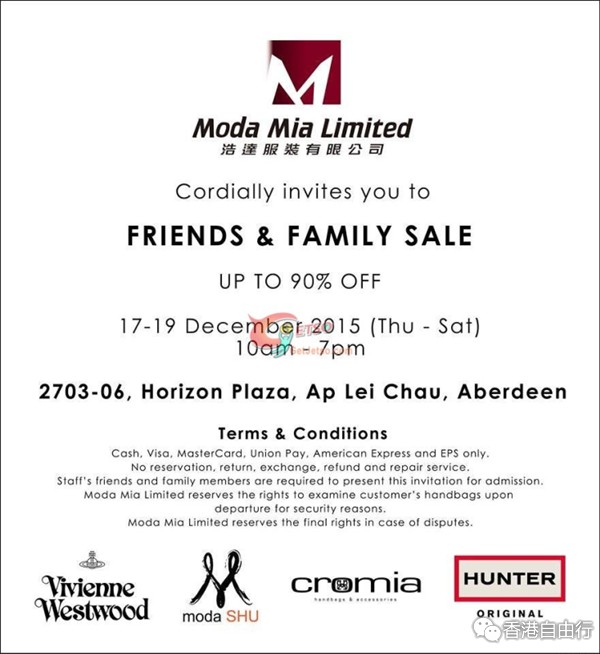 香港打折:名牌Vivienne Westwood/moda SHU/cromia等低至1折开仓优惠(15年12月17至19日)