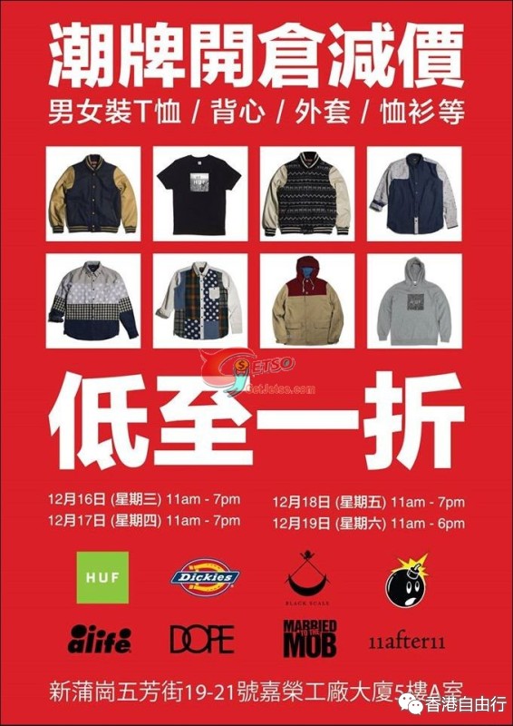 香港打折:潮牌低至1折开仓优惠(15年12月16至19日)