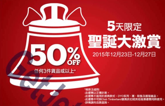 香港打折:Timberland全场半价圣诞优惠(至15年12月27日)