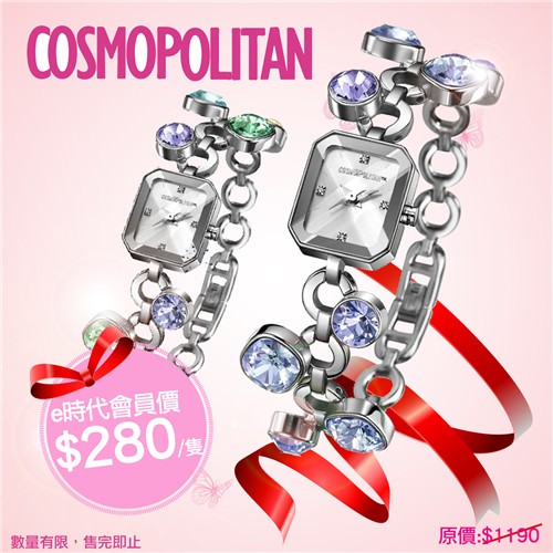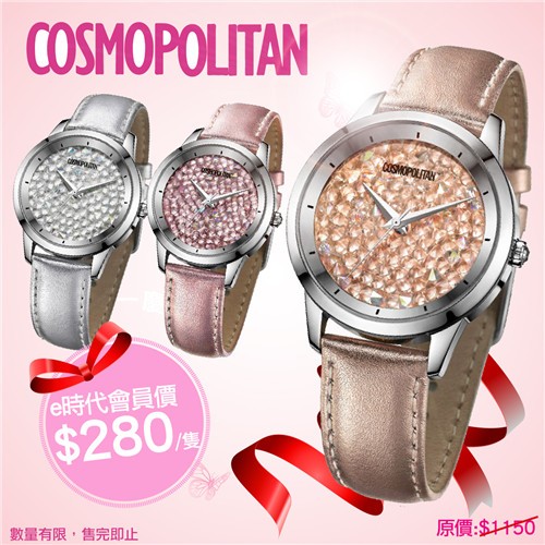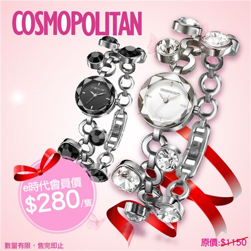 COSMO手表是由美国COSMOPOLITAN时尚杂志授权的时尚手表品牌,其设计时尚,个性鲜明,绝对是潮流的代表。手表用料名贵,日本原装进口石英机芯,表身採用不銹钢材质,镶嵌SWAROVSKI水晶,效果更为闪烁,而且还具有30米的生活防水性能。
