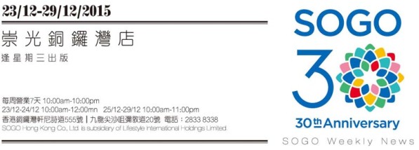 香港打折:sogo崇光百货铜锣湾店本周最新购物优惠(15年12月23日至12月29日)