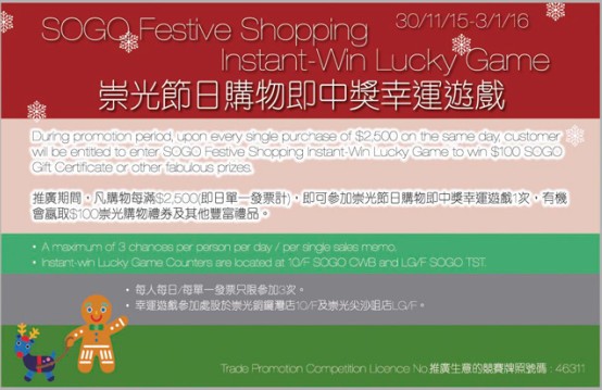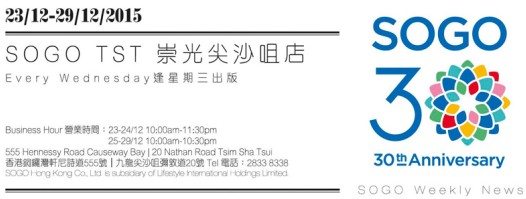 香港打折:sogo崇光百货尖沙咀店本周最新购物优惠(15年12月23日至12月29日)