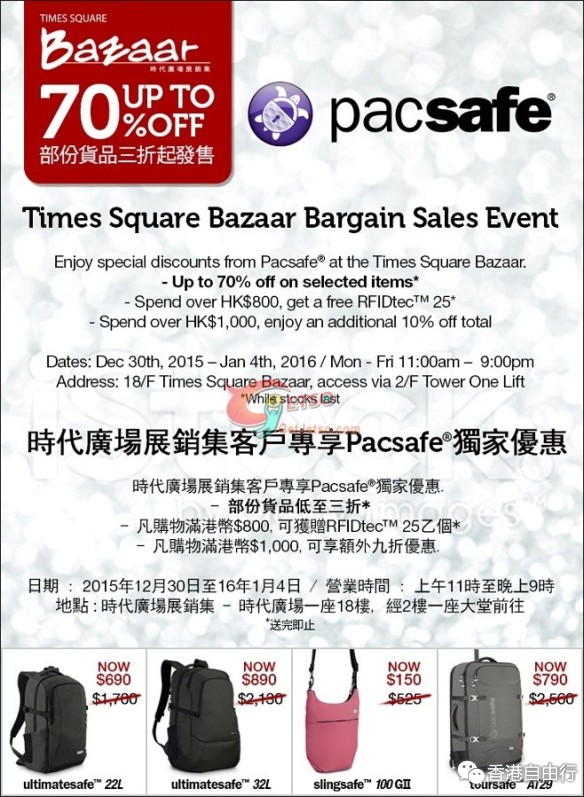 香港打折:时代广场Pacsafe旅行用品低至3折开仓优惠(至15年1月4日)