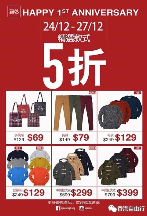 香港打折:SPAO精选款式低至5折优惠(至15年12月27日)