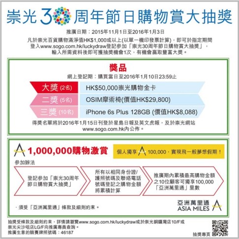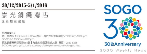 香港打折:sogo崇光百货铜锣湾店本周最新购物优惠(15年12月30日至16年1月5日)