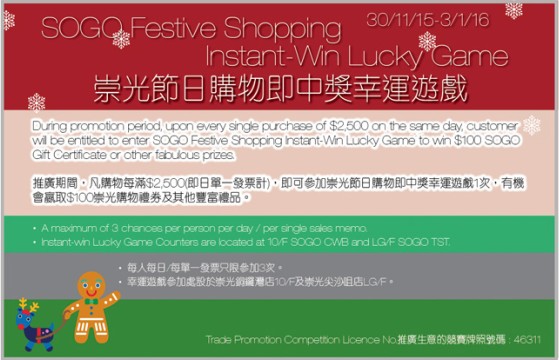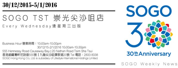香港打折:sogo崇光百货尖沙咀店本周最新购物优惠(15年12月30日至16年1月5日)