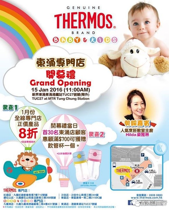 庆祝膳魔师东涌专门店隆重开幕, 即日起至1月31日, 膳魔师6间专门店全线货品8折优惠. 另开幕当日(1月15日), 头30位客人消费满$700 (折实后计算), 可获赠品一个 (价值$138).