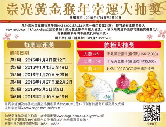 香港打折:sogo崇光百货铜锣湾店本周最新购物优惠(16年1月6日至16年1月12日)