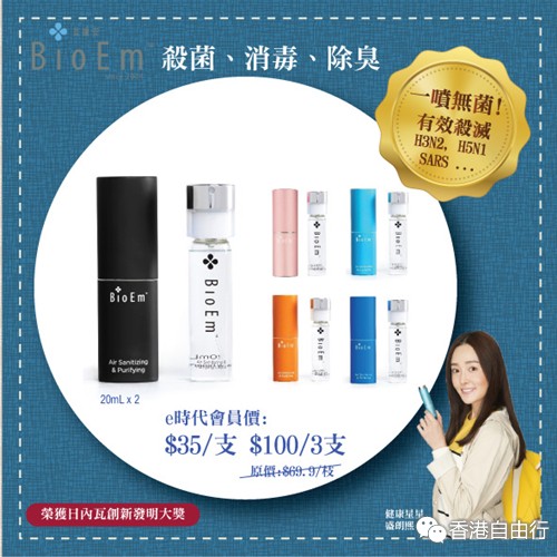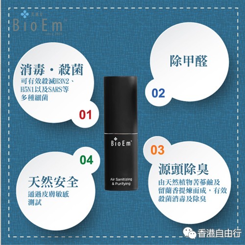 BioEm 防疫喷雾可直接喷洒于空气中或物件表面,能即时为居室杀灭病毒和细菌(沙士冠状病毒、禽流感病毒、人流感病毒等) 、及分解致敏原、异味和有机化合物等有害物质。产品使用天然植物精华,对人体无害,使用后无须冲洗。