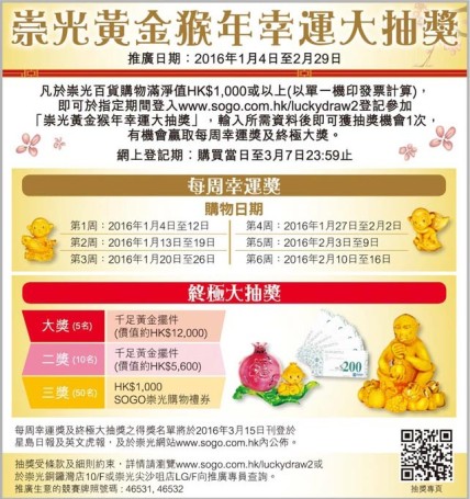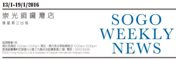 香港打折:sogo崇光百货铜锣湾店本周最新购物优惠(16年1月13日至16年1月19日)