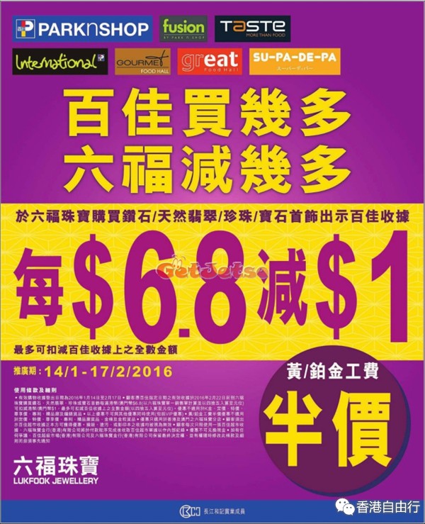 香港打折:六福珠宝X百佳超级市场推广优惠(至16年2月17日)