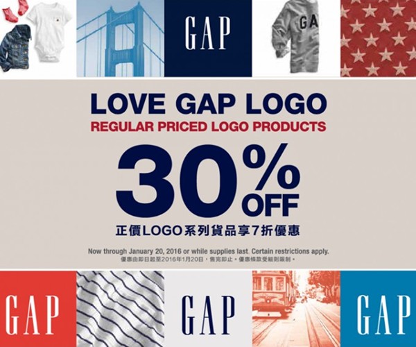 香港打折:Gap选购正价Logo系列货品、正红色货品及猴年系列货品,可享七折优惠!