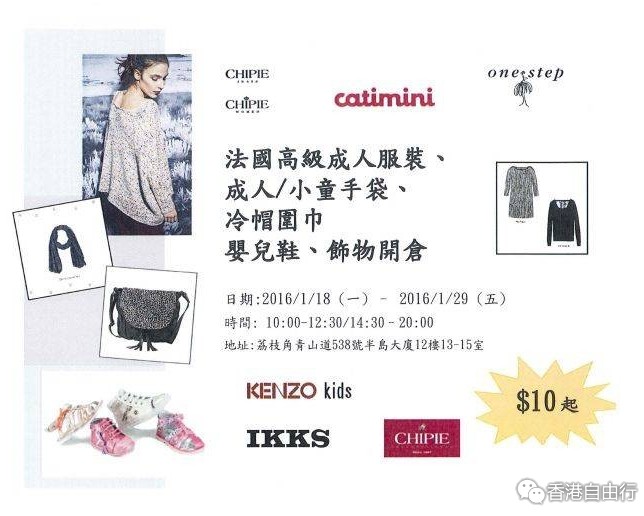 香港打折:法国品牌时装、手袋、围巾开仓低至$10起购物优惠(至16年1月29日)