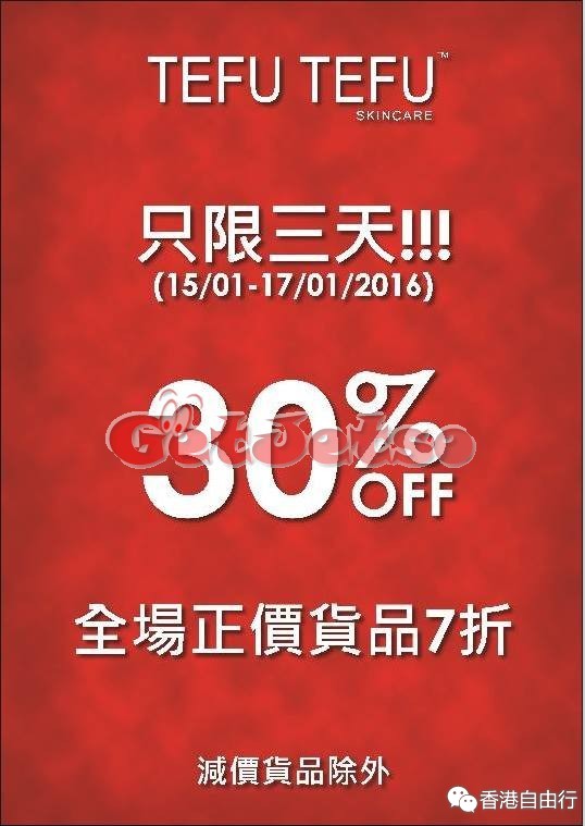 香港购物:TefuTefu Skincare正价货品7折优惠(至16年1月17日);
