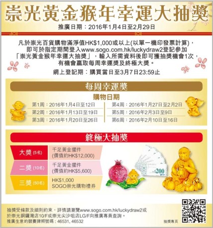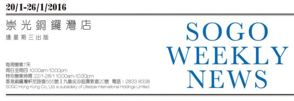 香港打折:sogo崇光百货铜锣湾店本周最新购物优惠(16年1月20日至16年1月26日)
