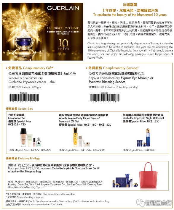 香港打折:Guerlain法国娇兰御庭兰花10周年礼遇及套装优惠(至16年2月14日)
