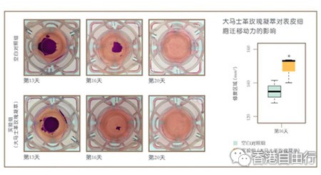 实验结果表明:珍稀大马士革玫瑰凝萃可以提高表皮细胞迁移速度,因而表皮细胞具备了占领格子原始表面的能力。与空白对照组相比,珍稀大马士革玫瑰凝萃可加速组织修复,只需16天即可使肌肤达到接近完全修复的程度。