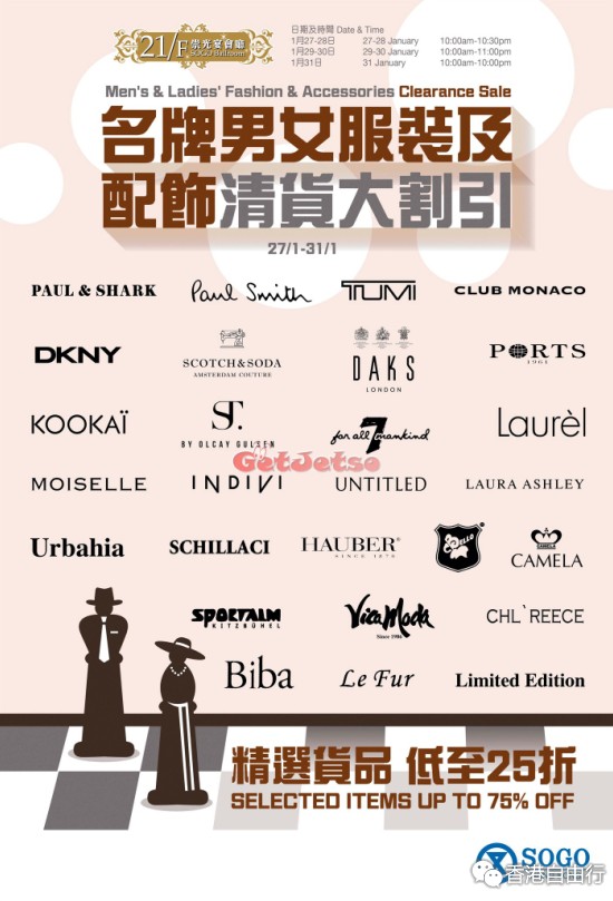 sogo崇光百货铜锣湾店21/F名牌男女服装及配饰清货大割引(16年1月27日至16年1月31日);
