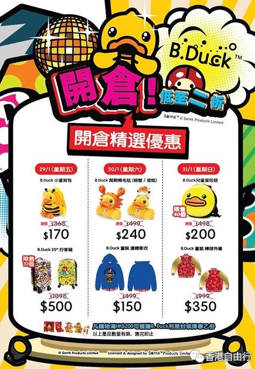 香港打折:B.Duck开仓大割引 指定商品低至二折优惠(16年1月29日至31日)