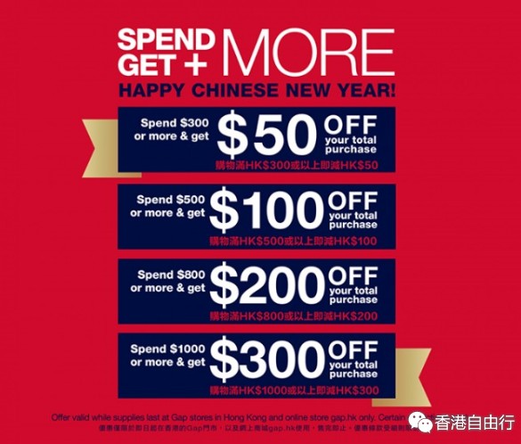 即日起至2月5日,购物满指定金额,即享精彩折扣优惠,让你尽情迎新接福;2月3日前,购物满HK$500,更可获赠Gap限量版新年手提袋一个!