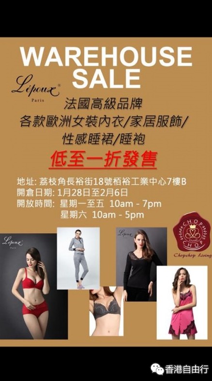 香港优惠:法国高级品牌 各款欧洲女装内衣/家居服饰低至一折发售(至16年2月6日)