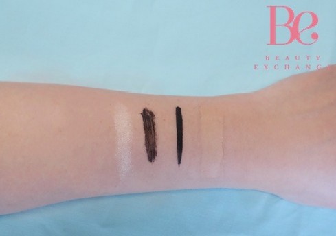 小编在手上分别画上平日会使用的化妆品:闪粉眼影、防水睫毛膏、防水眼线液以及粉底液。
