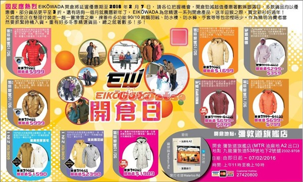 香港打折:EIKOWADA 低至3折开仓优惠(至16年2月7日)