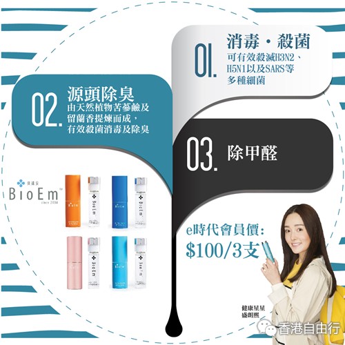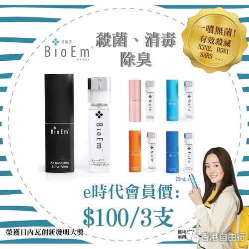 BioEm 防疫喷雾可直接喷洒于空气中或物件表面,能即时为居室杀灭病毒和细菌(沙士冠状病毒、禽流感病毒、人流感病毒等) 、及分解致敏原、异味和有机化合物等有害物质。产品使用天然植物精华,对人体无害,使用后无须冲洗。