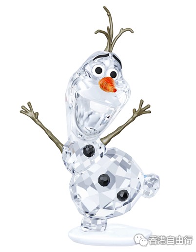 而可爱趣致的雪宝,则以闪烁耀眼的透明仿水晶为主体,用鲜艳夺目的橙色鼻子加以点缀。除以单脚站立的精灵姿态示人外,他脸上所带的灿烂笑容,使得这款闪现着380个切面的塑像妙趣横生。
