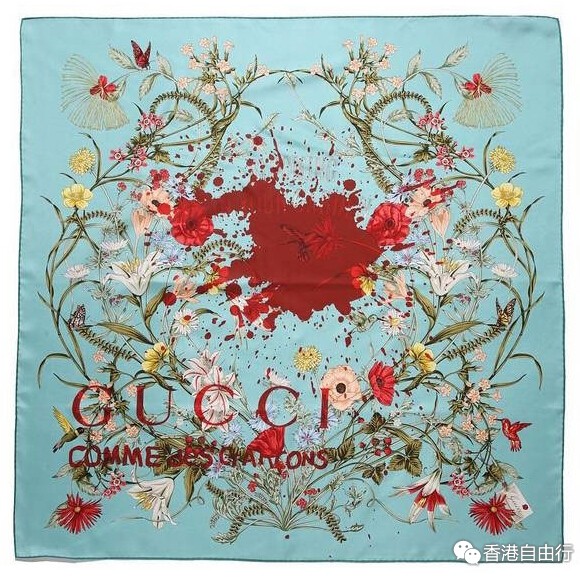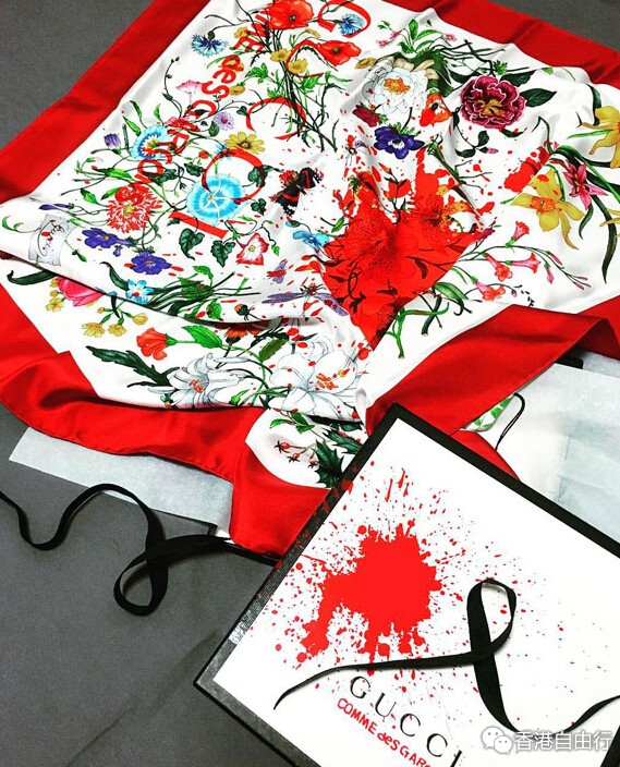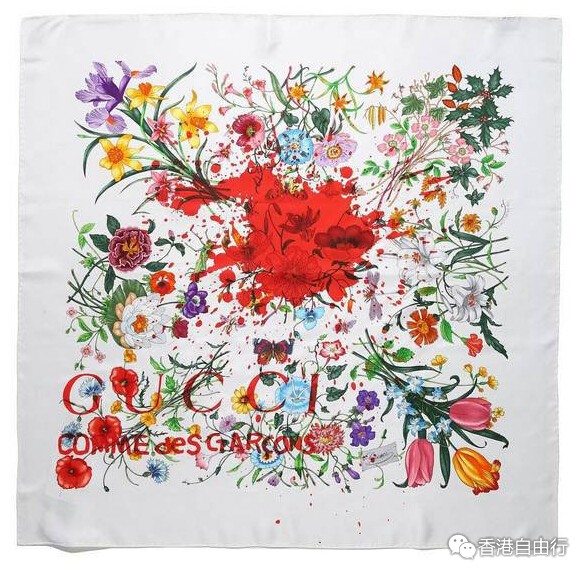 日本时尚品牌 Comme des Garcons(川久保玲)联合 Gucci(古驰)推出合作丝巾系列。在丝巾的设计上,以古驰创意总监 Alessandro Michele 赋予时装系列的浪漫印花作为主轴,并且印上了双方的红色Logo,缔造出无与伦比的精致美感。