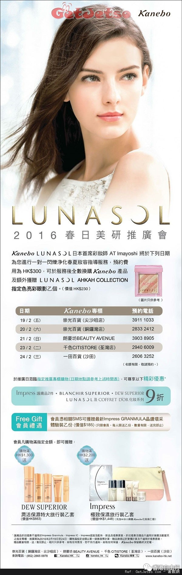 香港打折:Kanebo Lunasol 彩妆推广会购物优惠(至16年2月24日);