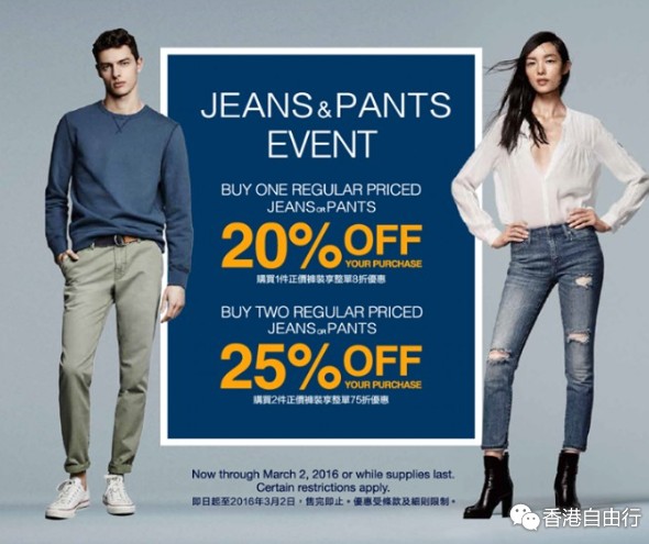香港打折:GAP即日起至3月2日 购买2件正价裤装,全单可享高达75折优惠