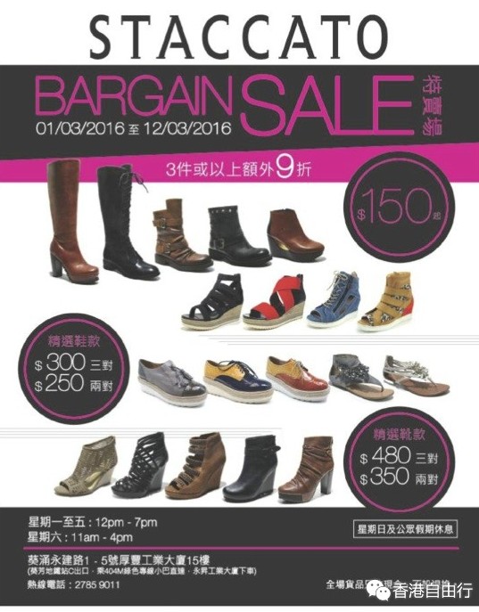 香港打折:STACCATO BARGAIN SALE 特卖场优惠$150起(3月1至12日)