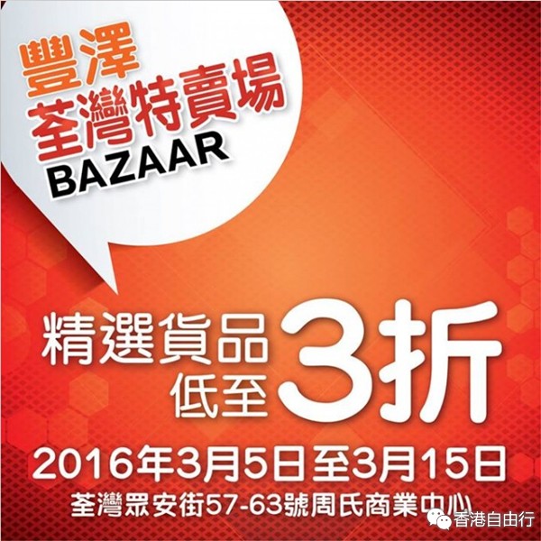香港打折:丰泽荃湾特卖场精选货品低至3折购物优惠(16年3月5日至3月15日)