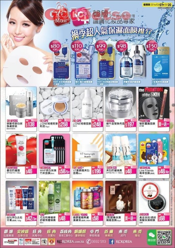 香港打折:KC Korea 换季超人气保湿面膜购买优惠(至16年3月20日)