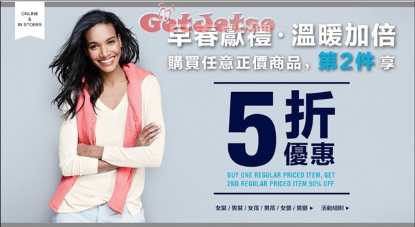香港打折:GAP 正价商品第2件半价优惠(至16年3月15日);