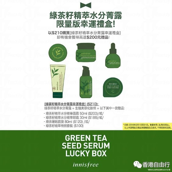 由即日起至3月31日期间,Innisfree在香港及澳门全线的专门店将推出「绿茶籽精萃水分菁露限量版幸运礼盒」。每个幸运礼盒售价 HK$210,包括绿茶籽精萃水分菁露一支及生机美容化妆棉一包,同时即有机会获赠高达HK$200的绿茶系列产品一份!