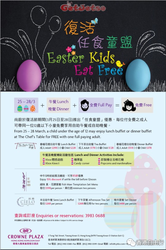 香港打折:九龙东皇冠假日酒店复活节小童免费享用自助餐优惠(16年3月25-28日)