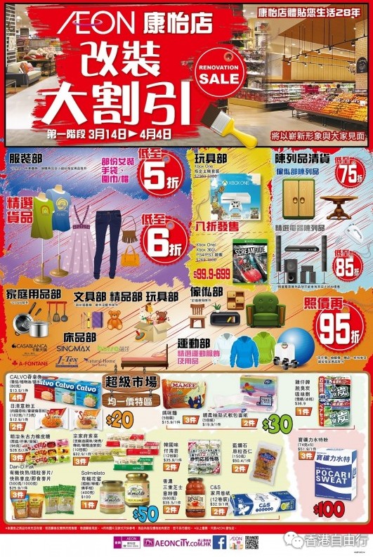 香港打折:AEON康怡店改装大割引低至5折优惠(3月14至4月4日)