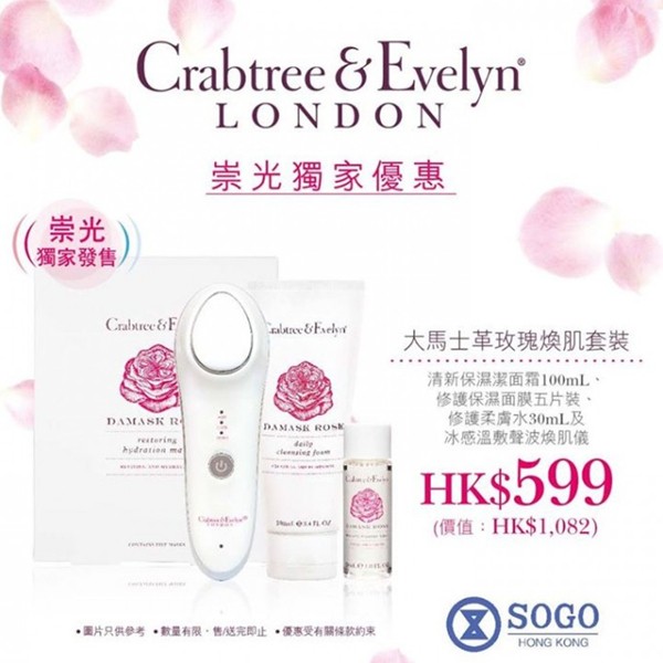 [Crabtree & Evelyn崇光独家优惠] 全新冰感温敷声波焕肌仪,令你安坐家中亦可享自主美容保养,简单快捷。立即去崇光百货以优惠价*选购「大马士革玫瑰焕肌套装」,每个女士都可以有亮丽肌肤!