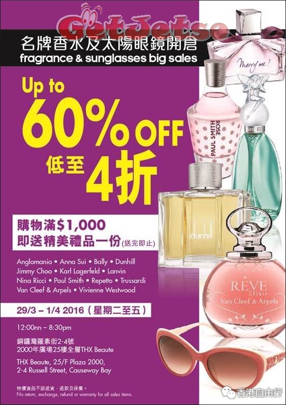 名牌香水及太阳眼镜低至4折开仓优惠(16年3月29日至4月1日);