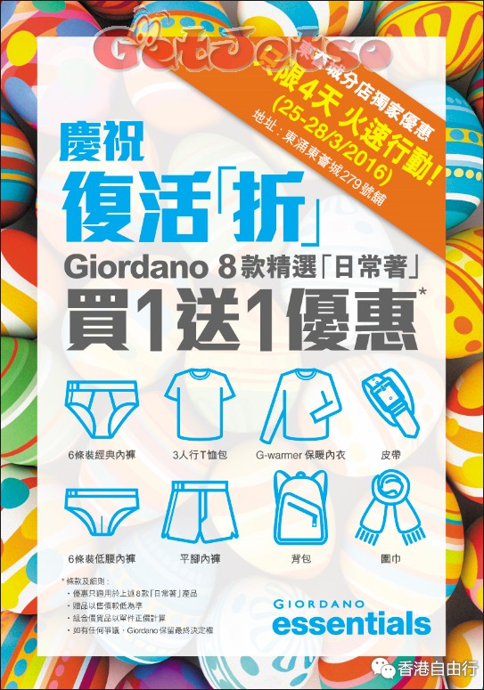 香港打折:Giordano 东荟城分店独家「日常穿」买1送1优惠(16年3月25至28日)